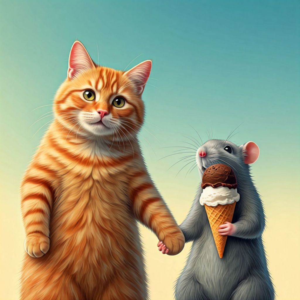 In the heart of a bustling city, an unlikely pair found solace in each other. A sleek, ginger cat named Oliver and a tiny, gray rat named Luna shared a bond that defied expectations. One sunny afternoon, as they strolled through a park, Oliver spotted an ice cream vendor. With a mischievous glint in his eye, he suggested a treat.